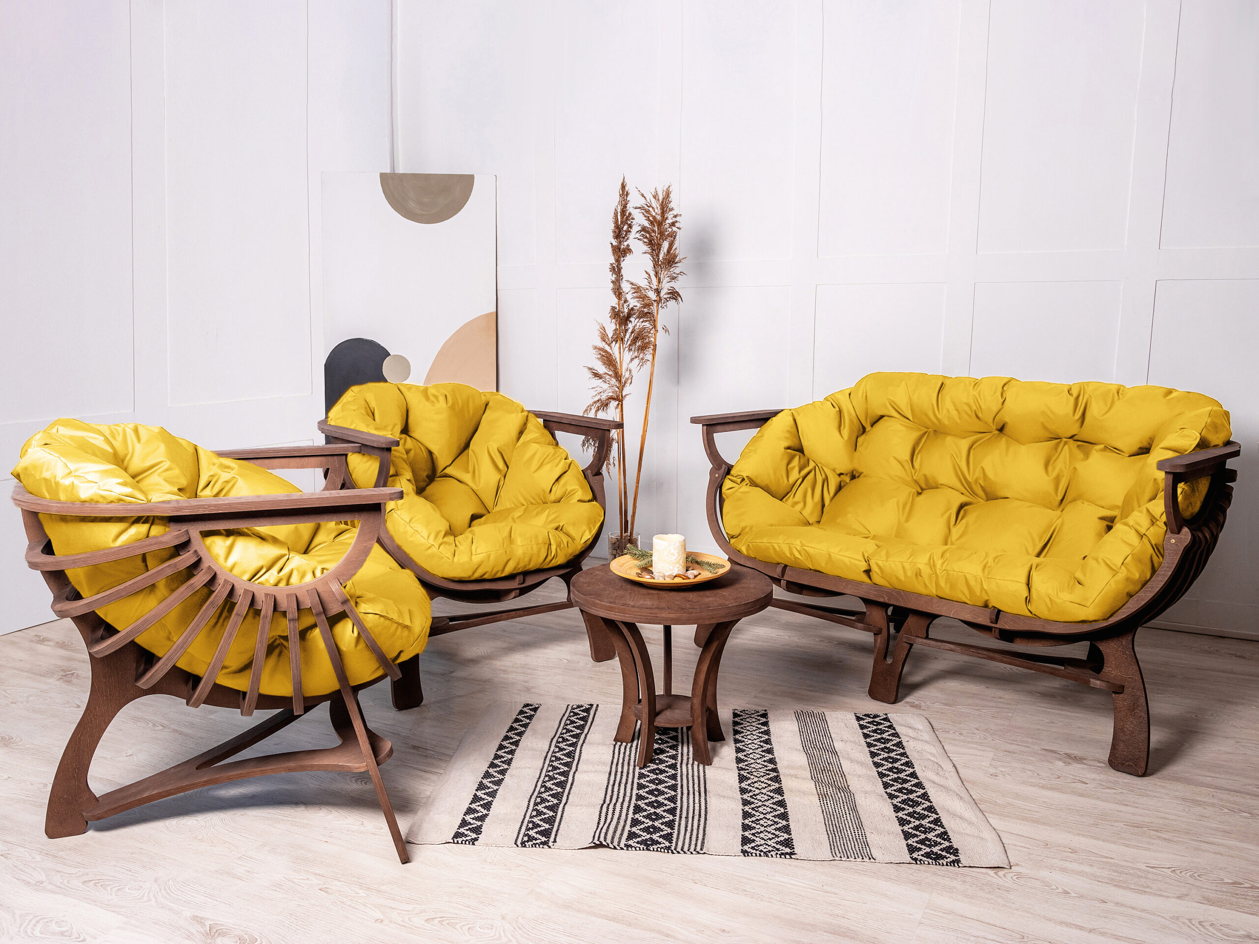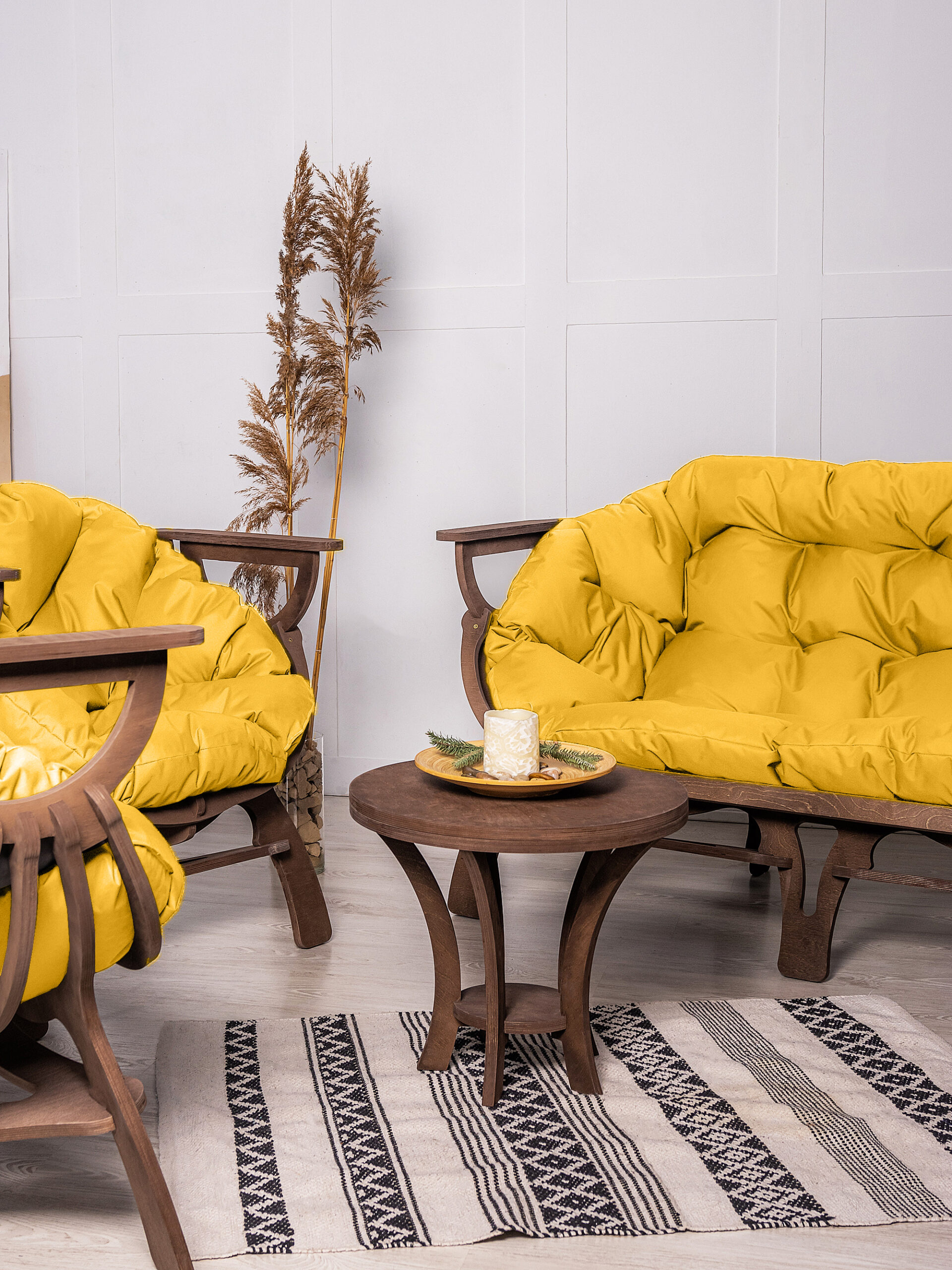 Что входит в набор: ▸ Диван — 1 шт. ▸ Кресло — 1 шт. ▸ Материал: массив березы (нешлифованный, без