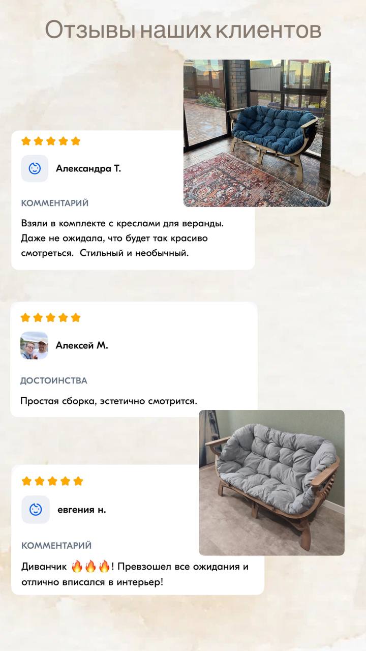 Удобный диван, изготовленный из экологичных материалов, идеально дополнит интерьер вашего загородного дома. Модель обладает удобной конструкцией, а ее стильный дизайн и устойчивость к внешним воздействиям делают диван отличным выбором для отдыха как на свежем воздухе, так и в помещении. Подушки входят в комплект.