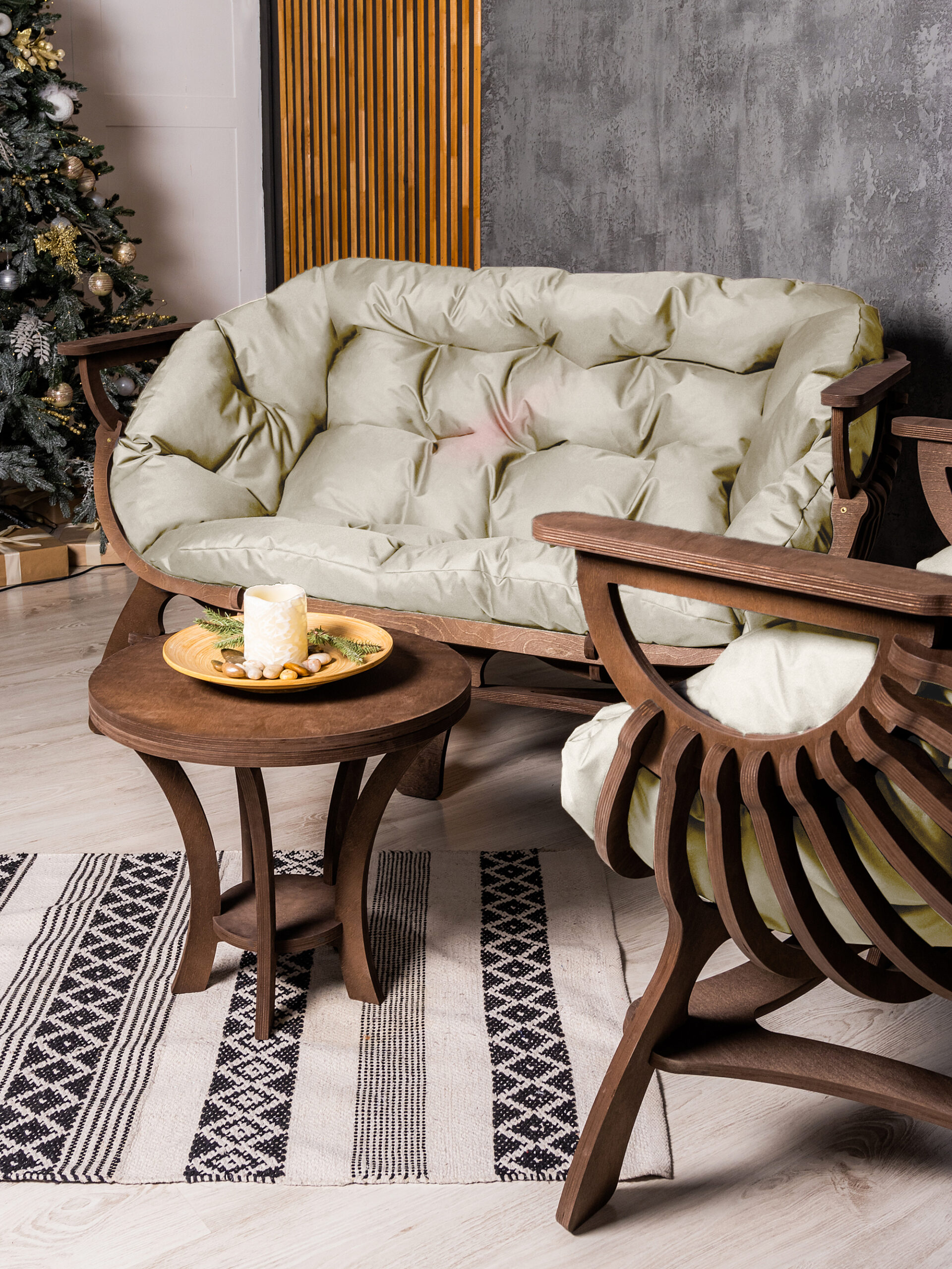 Универсальный мебельный комплект, состоящий из дивана, двух кресел и журнального столика. Подушки входят в комплект. Просторный диван — отличное решение